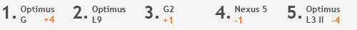 Bij LG zijn de goedkopere toestellen nog altijd populair maar de duurdere LG G2 doet het ook goed. Dit toestel is van de 4e naar de 3e plaats gestegen. De LG Optimus G staat nu op de eerste plaats, voornamelijk vanwege enkele scherpe acties die er momenteel zijn in combinatie met dat toestel. De nieuwe L-serie is overigens uitgekomen en het interessant wanneer deze zich en weg gaan banen naar de top 5. Het zijn namelijk erg scherp geprijsde toestellen met prima specificaties.